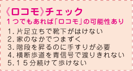 ロコモティブは機関車、移動という意味ですが、医学的には、関節、骨、筋肉などの運動器を意味します。運動器が衰え、段差で転倒や骨折する人が急増していますが、特にひざ痛、腰痛症、骨粗鬆症の人は注意が必要です。