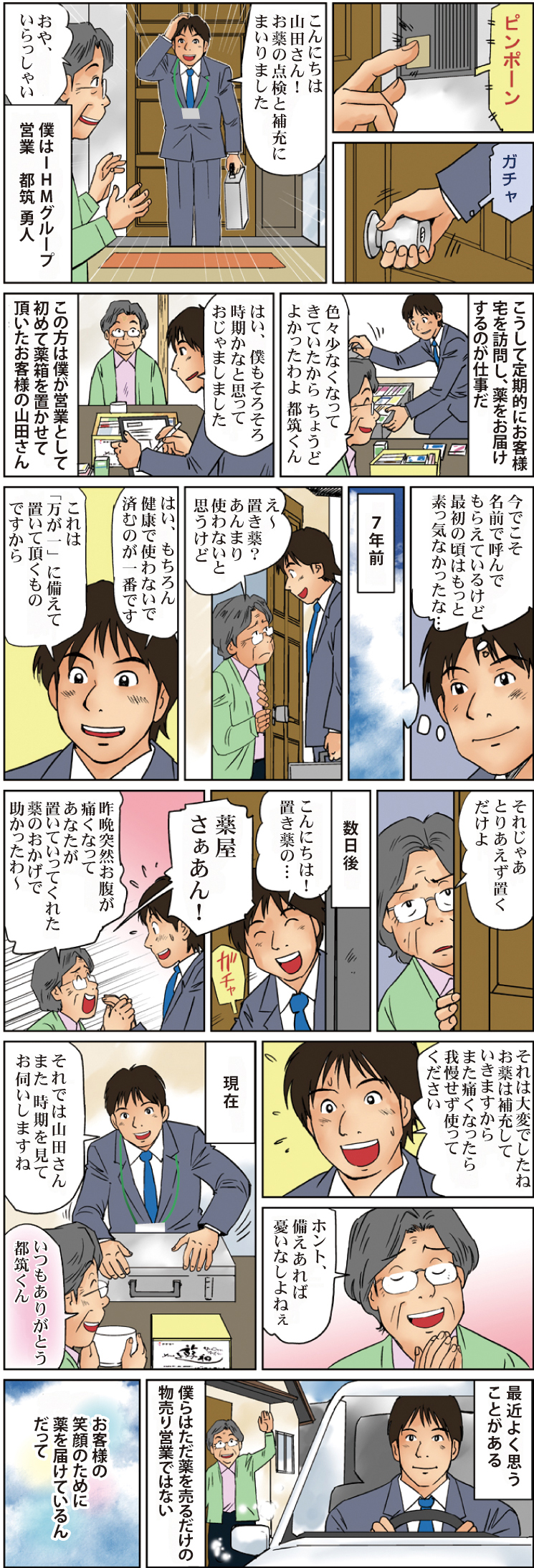 全国各地でご契約頂いているお客様から、体調や症状などをとことんお伺いし、それに合わせた常備薬や関連商品、健康情報、生活改善のご提案をします。健康で健やかな生活創りのお役に立てるよう、きめ細かな健康アドバイスを行っています。